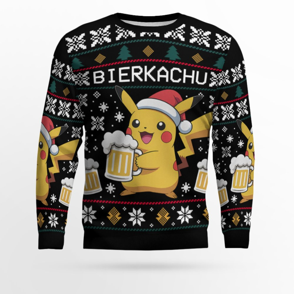 Celebrate the holidays with a touch of Pokémon magic and a whole lot of beer fun! The BIERKACHU design is sure to be the talk of your ugly sweater party, blending the beloved Pikachu character with a frosty beer mug for a truly unique holiday look. Whether you’re at home, at a party, or just enjoying the season with loved ones, this sweater lets you show off your festive spirit with style.