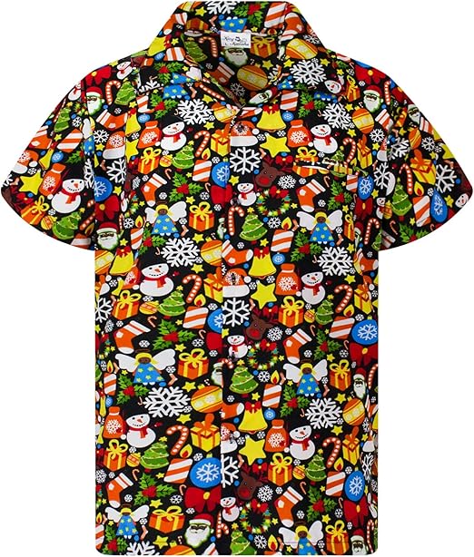 Featuring a classic holiday pattern inspired by traditional Christmas colors and motifs, this shirt captures the joyful energy of the season while keeping your look laid-back and stylish. The lightweight, breathable fabric ensures comfort from morning gatherings to evening parties, making it perfect for both indoor celebrations and sunny holiday getaways.