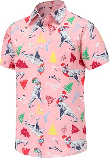 Featuring a lively print of dinosaurs wearing Santa hats, it’s the perfect blend of humor and holiday spirit. Whether you’re heading to a Christmas party, celebrating on a tropical getaway, or looking for a standout outfit for family gatherings, this shirt keeps your style relaxed, cheerful, and unforgettable.