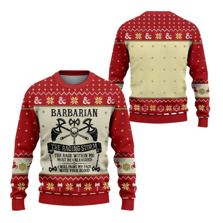 Unleash your inner warrior this holiday season with the 2025 Christmas “DnD Barbarian: The Raging Storm” Ugly Christmas Sweater — where fantasy adventure meets festive fun. Designed for Dungeons & Dragons fans who rage both on the battlefield and at holiday parties, this sweater combines epic artwork, cozy comfort, and a touch of chaotic cheer worthy of any adventuring party.