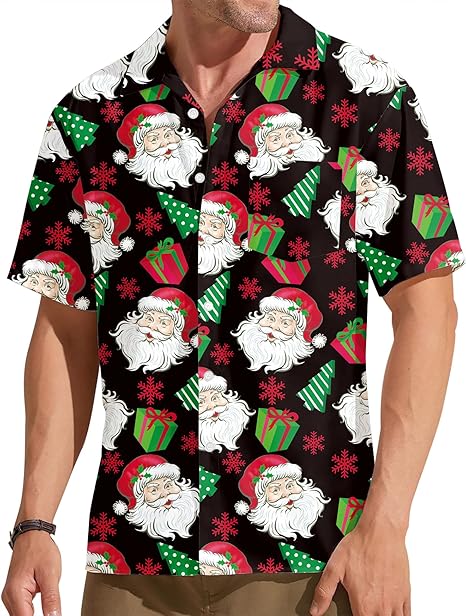 Featuring a vibrant print of holiday decorations, Santa Claus, reindeer, and other festive elements, it brings holiday cheer to any occasion. Perfect for Christmas parties, family gatherings, or tropical vacations, this shirt adds personality and a joyful vibe to your wardrobe.