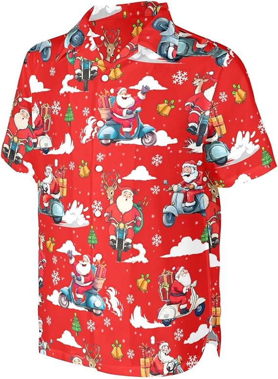 Featuring a lively print of a jolly Santa Claus riding a motorcycle among holiday decorations, it captures the excitement and humor of the season. Perfect for Christmas parties, tropical vacations, or casual festive gatherings, this shirt adds personality and fun to any occasion.
