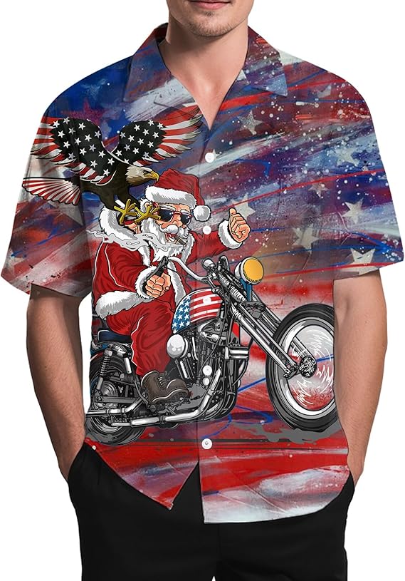 Featuring a lively print of a jolly Santa Claus riding a motorcycle among holiday decorations, it captures the excitement and humor of the season. Perfect for Christmas parties, tropical vacations, or casual festive gatherings, this shirt adds personality and fun to any occasion.