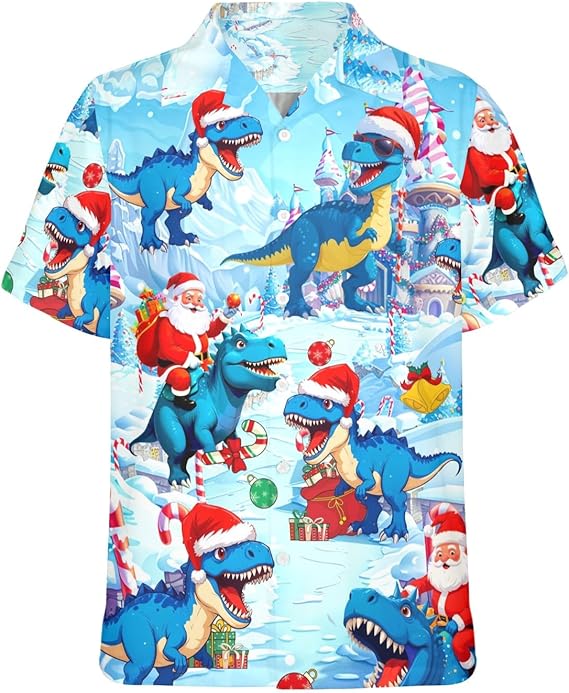 Featuring a lively print of Santa Claus enjoying holiday fun alongside dinosaurs and festive decorations, it captures the humor, joy, and creativity of the season. Ideal for Christmas parties, family gatherings, or tropical vacations, this shirt adds personality and festive charm to any occasion.