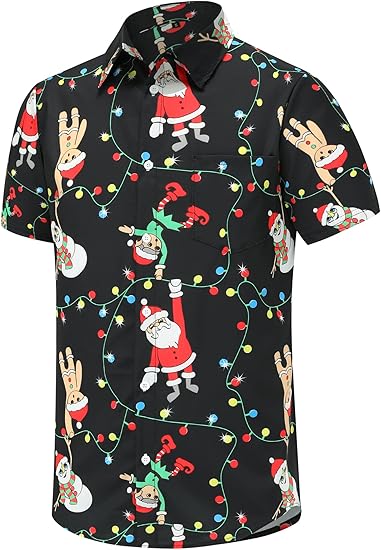 Made from lightweight, breathable fabric, this shirt ensures comfort from morning to night. Its relaxed fit, short sleeves, and button-down front make it easy to wear for both casual and festive occasions, keeping your look effortlessly merry.