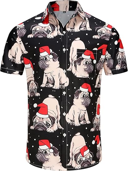 Featuring a lively print of cute dogs wearing Santa hats surrounded by tropical and holiday motifs, it captures the joy and humor of the season. Ideal for Christmas parties, family gatherings, or tropical vacations, this shirt brings personality and cheerful holiday spirit to any occasion.