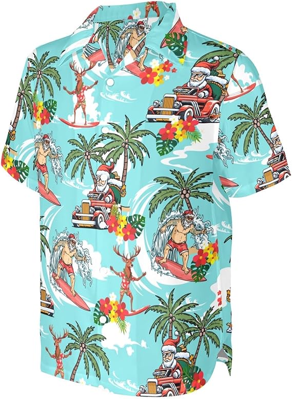 Featuring a lively print of Santa Claus surfing among holiday decorations, it captures the joy and humor of the season. Perfect for Christmas parties, tropical vacations, beach gatherings, or casual festive events, this shirt adds personality and cheer to any occasion.