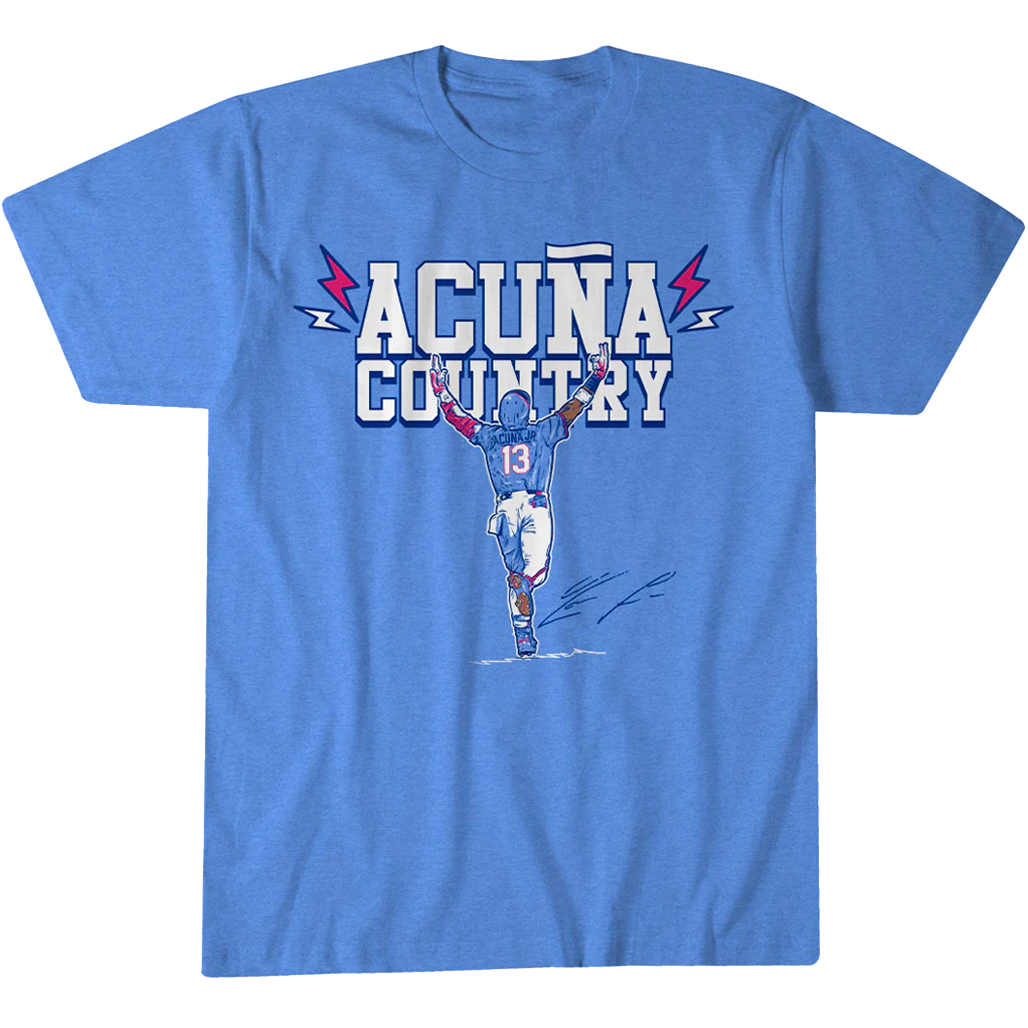 Featuring a bold “Country” inspired graphic paired with Atlanta Braves and Ronald Acuña Jr. elements, the design blends cultural flair with modern baseball style. Perfect for game days, Braves fans, and supporters of elite talent, this shirt delivers comfort and standout presence.