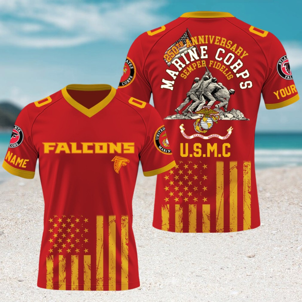 Crafted with advanced sports-grade printing, every number, emblem, and patriotic detail is sharp, vibrant, and built to last. The fusion of Falcons colors with Marine Corps symbols creates a bold look that represents power, honor, and unwavering commitment.