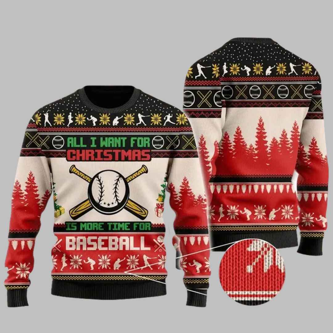 This unique Christmas sweater features a classic baseball design with a festive twist. A bold baseball with crossed bats takes center stage, surrounded by festive Christmas colors and patterns. The playful message “All I Want for Christmas is More Time for Baseball” clearly expresses your love for the game.
