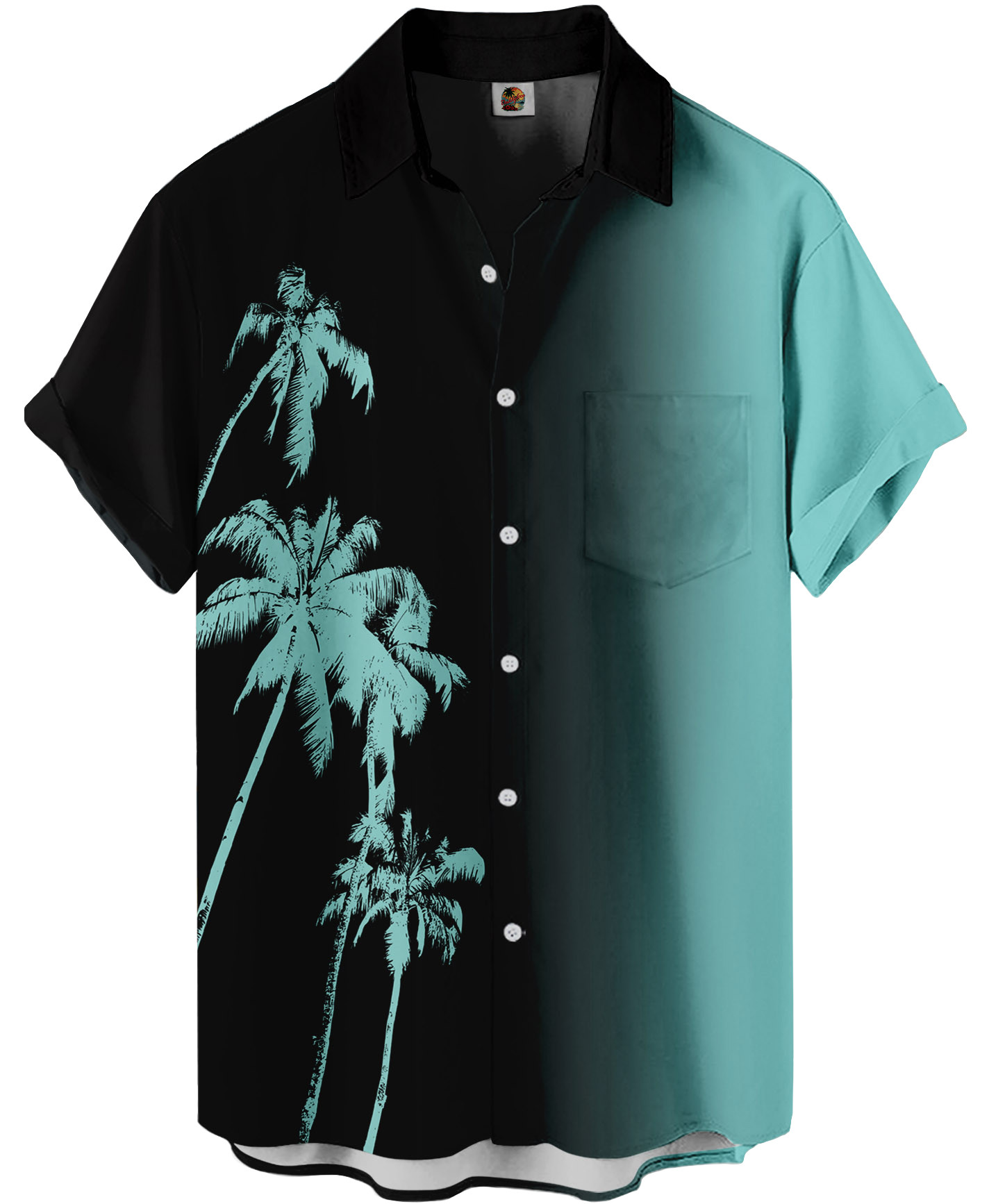 Pattern: All-over palm tree print with black-to-turquoise gradient background