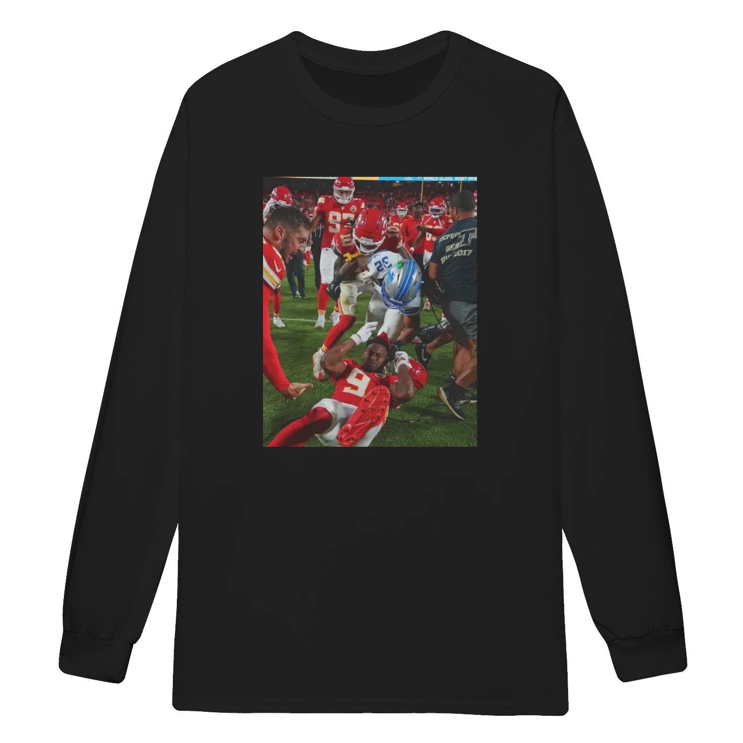 Iconic NFL Moment Design: Featuring an unforgettable moment between Brian Branch and JuJu Smith-Schuster, this shirt commemorates one of the most heated matchups on the field. The design captures the essence of football rivalry, intensity, and sportsmanship in a bold, graphic format.