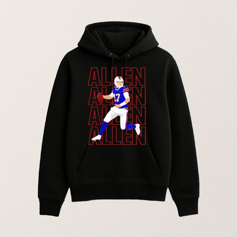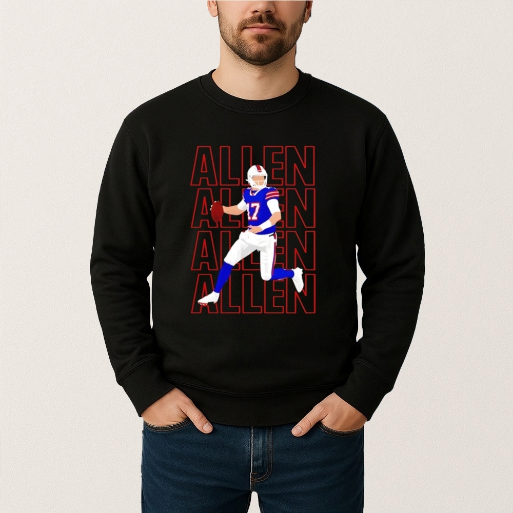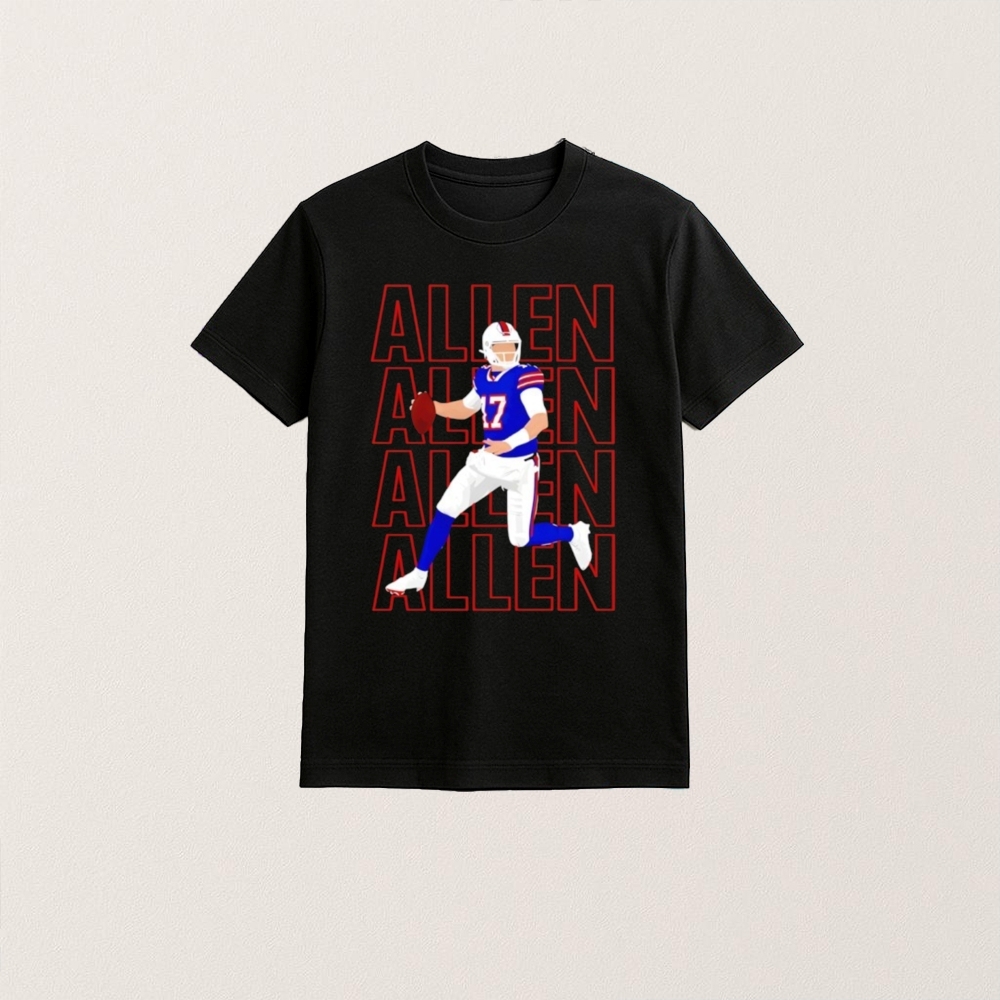 The “Josh Allen 17 Allen Allen Allen Allen” T-shirt is a creative expression that taps into the fervent fan culture surrounding the Buffalo Bills and their star quarterback, Josh Allen. Since being drafted by the Bills in 2018, Allen has become a central figure in the team’s resurgence, leading them to multiple playoff appearances and earning a reputation for his strong arm and dynamic play. This period has been marked by significant events, such as the Bills’ first AFC Championship Game appearance in decades and Allen’s record-breaking performances. The shirt’s repetitive design reflects the excitement and enthusiasm of Bills Mafia, the team’s passionate fan base, who have embraced Allen as a symbol of hope and success. The shirt also plays into the broader trend of sports fandom where players become cultural icons, inspiring debates, rumors, and a variety of fan-made merchandise that celebrates their impact on the game and community.