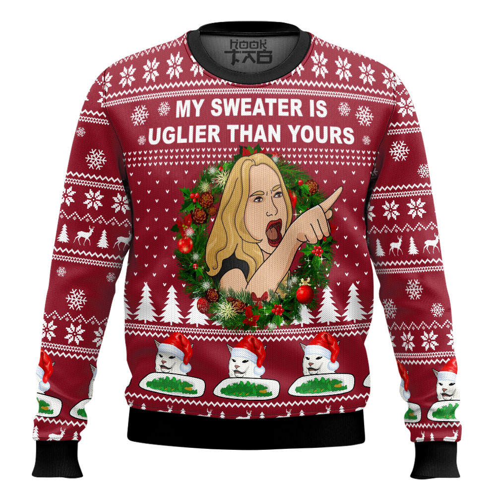 Cat Woman Meme Ugly Christmas This Curvy Glams exclusive Ugly Christmas Sweater design is guaranteed to get attention and get the party started. It?s sure to be your best holiday purchase yet! Material: Our sweaters are made from high-quality polyester wool blend, which keeps you warm and never crack, peel or flake. Features a specialty high definition heat-dye application that ensures long lasting color vibrancy even after machine washing. All our sweaters are handcrafted, cut and sewn one-by-one for the highest quality standard Sizing: Unisex fit. Click on size chart button above add to cart button for addiditional sizing information Care Instructions: Regular handwash; Machine wash (max 40? or 105F); Do not bleach; Iron on a low heat;Tumble dry.