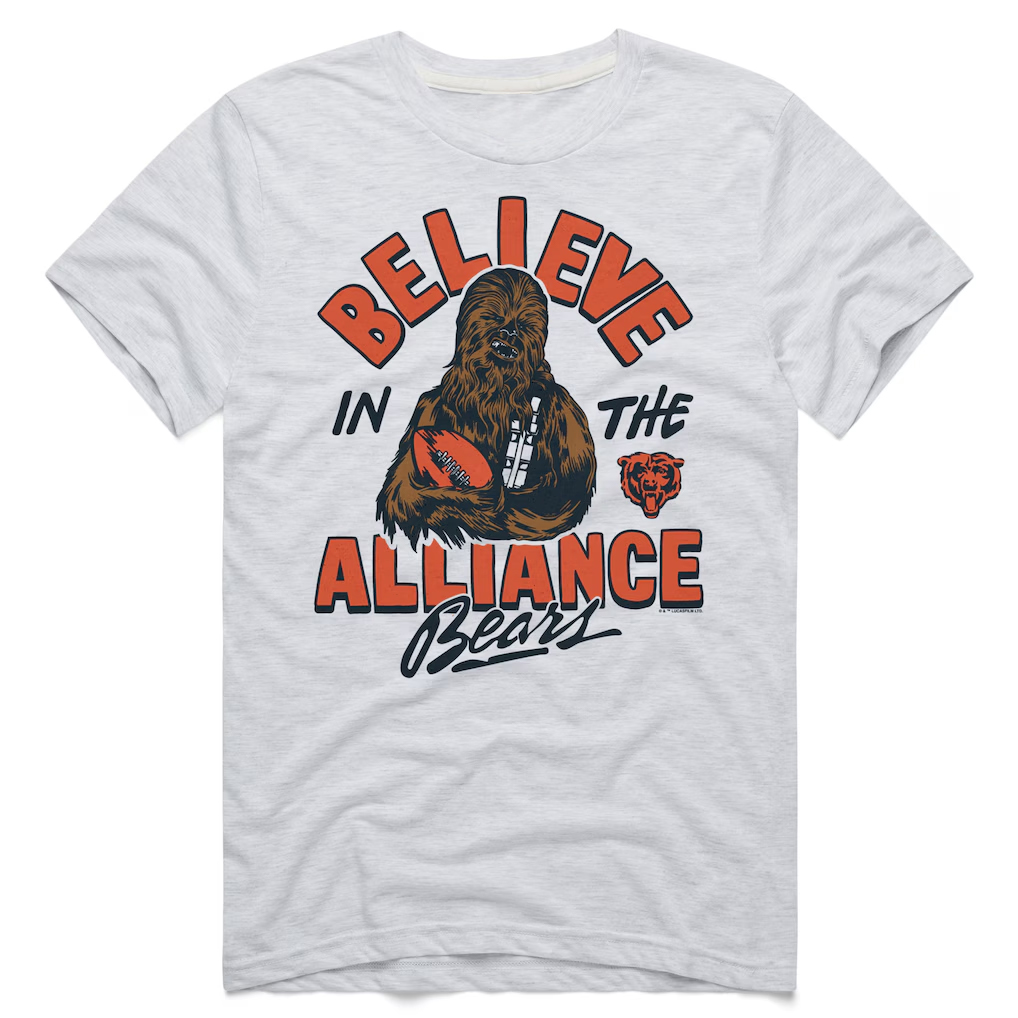 From kickoff to hyperspace, show the world that your allegiance runs deep. Whether you’re tailgating at Soldier Field or watching your favorite trilogy, this tee keeps your Bears loyalty shining like a twin sun over Tatooine.