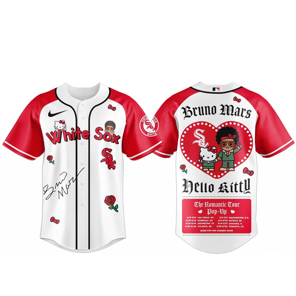 Step into a bold mix of style and charm with the Chicago White Sox Bruno Mars x Hello Kitty 2026 The Romantic Tour Baseball Jersey. This unique design blends White Sox identity with Bruno Mars’ smooth romantic vibe and Hello Kitty’s iconic cuteness for a modern and eye-catching look.