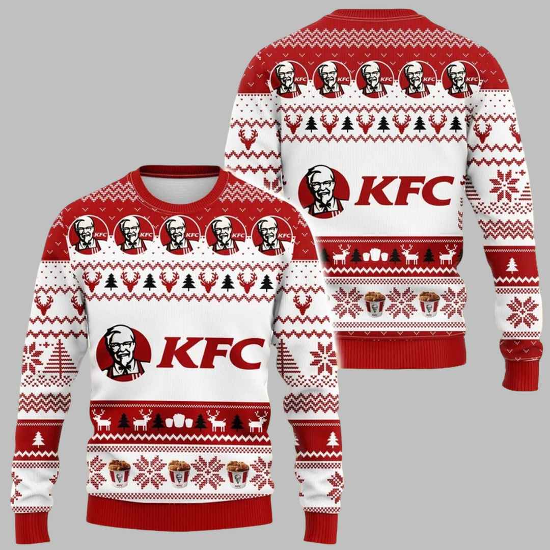 This unique Christmas sweater features a classic KFC-themed design with a festive twist. The iconic Colonel Sanders logo takes center stage, surrounded by festive Christmas colors, snowflakes, and even buckets of fried chicken! It’s a fun and quirky way to combine your love for KFC with the holiday spirit.