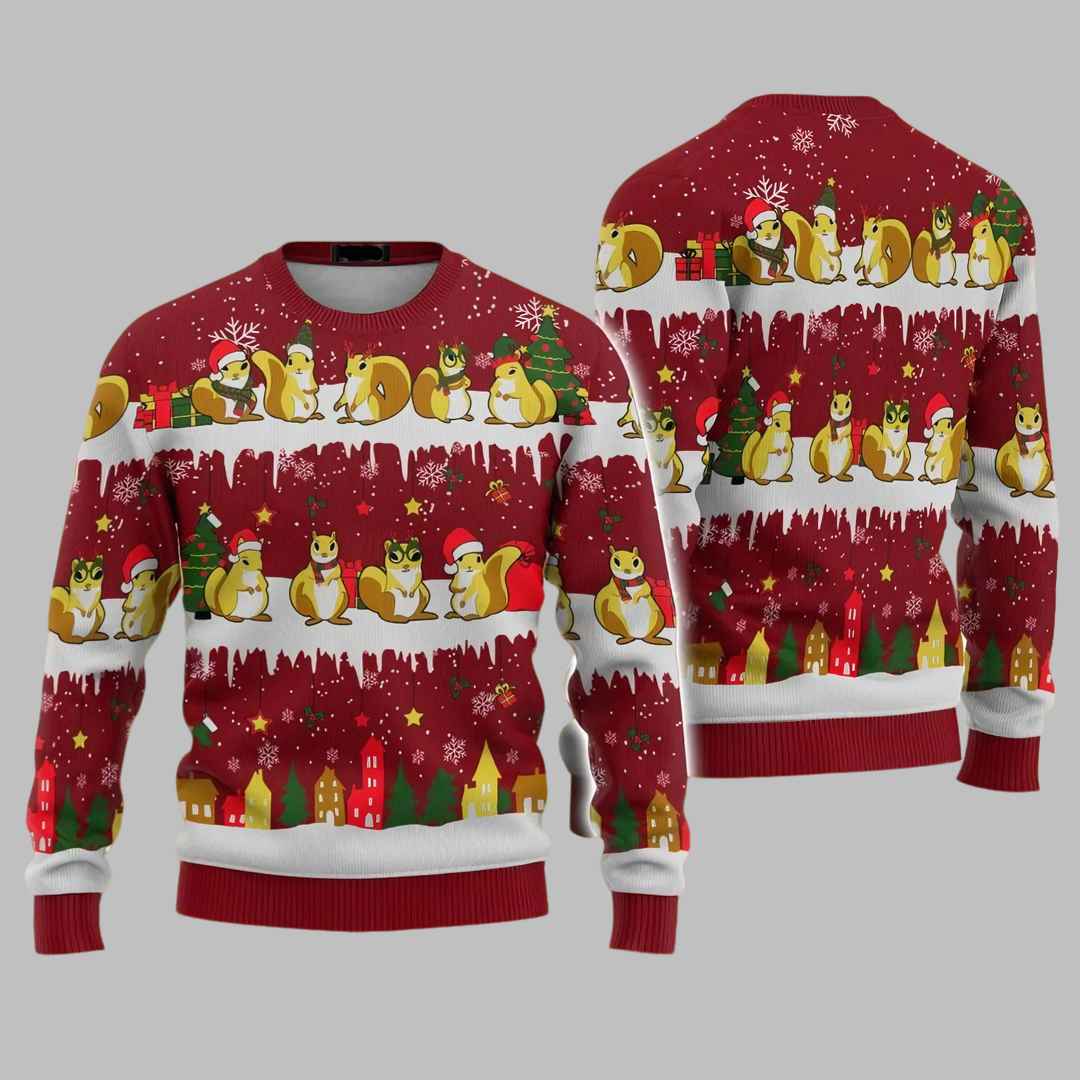 This eye-catching knitted sweater features a classic ugly Christmas sweater design with an adorable squirrel twist. The front showcases rows of playful squirrels dressed in Santa hats, holding gifts, and perched on snowy branches. The back continues the festive theme with a delightful scene of squirrels frolicking in a winter wonderland. Made from high-quality materials, this sweater is not only visually appealing but also warm and comfortable for those chilly winter days.