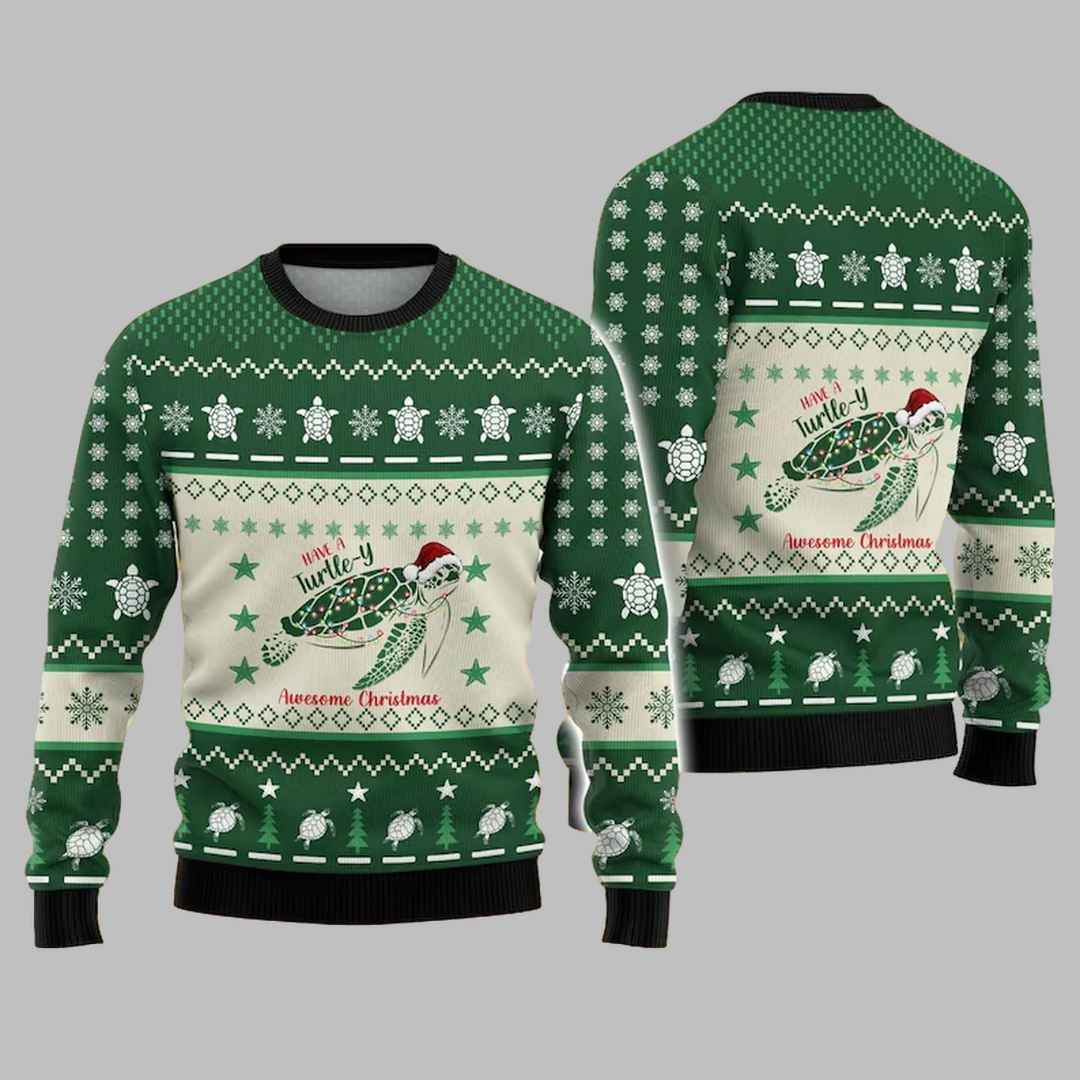 This isn’t your average Christmas sweater. The Christmas Turtle Ugly Christmas Sweater features an adorable turtle decked out in a Santa hat, swimming through a festive pattern of snowflakes and Christmas trees. With the playful message “Have a Turtle-y Awesome Christmas,” this sweater is sure to bring smiles and spread holiday cheer.