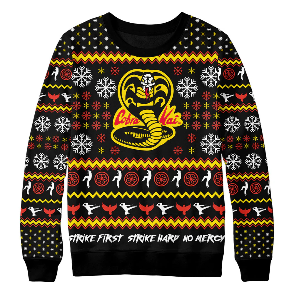 Show off your Cobra Kai spirit this holiday season with the Cobra Kai Never Dies Ugly Christmas Sweater! Channel the fierce rivalry, dojo pride, and iconic quotes from Cobra Kai and The Karate Kid franchise. Whether you’re a Cobra Kai loyalist or a Miyagi-Do fan, this sweater is the perfect way to celebrate the holidays with a nod to one of the most iconic martial arts series of all time. With its bold design and unforgettable message, this is the sweater you need for those who believe that Cobra Kai never dies!