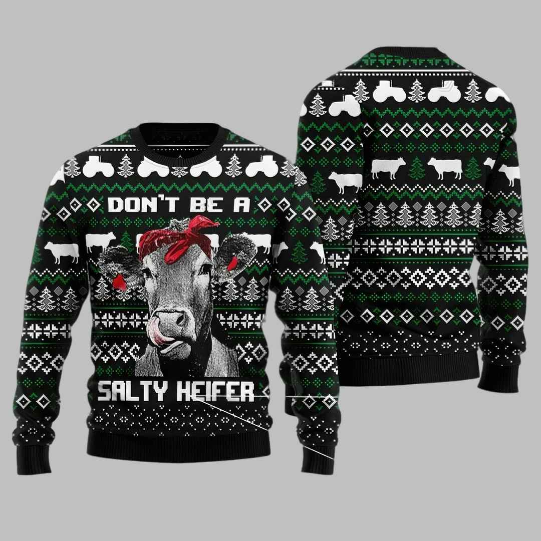 This unique Christmas sweater features a sassy cow sporting a festive red bandana, complete with a playful tongue sticking out. The phrase “Don’t Be a Salty Heifer” adds a humorous touch, reminding everyone to stay sweet this holiday season. The sweater also incorporates festive Christmas patterns with adorable cows, tractors, and Christmas trees for a truly festive touch.