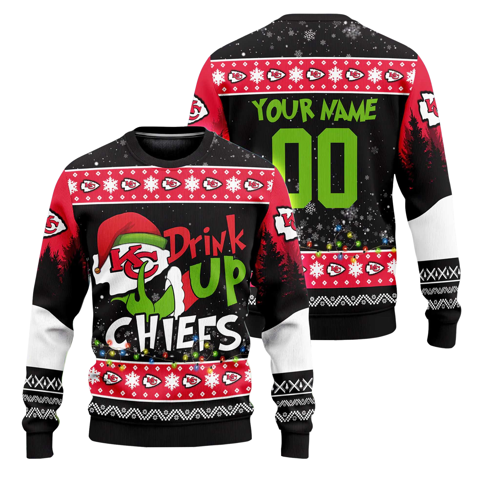 Custom Name and Number 2025 Chiefs Drink Up Grnch Christmas Ugly Sweater