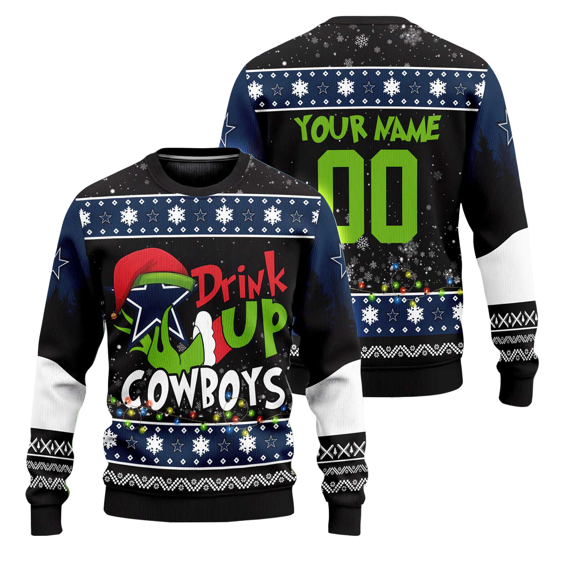 Custom Name and Number 2025 Cowboys Drink Up Grnch Christmas Ugly Sweater