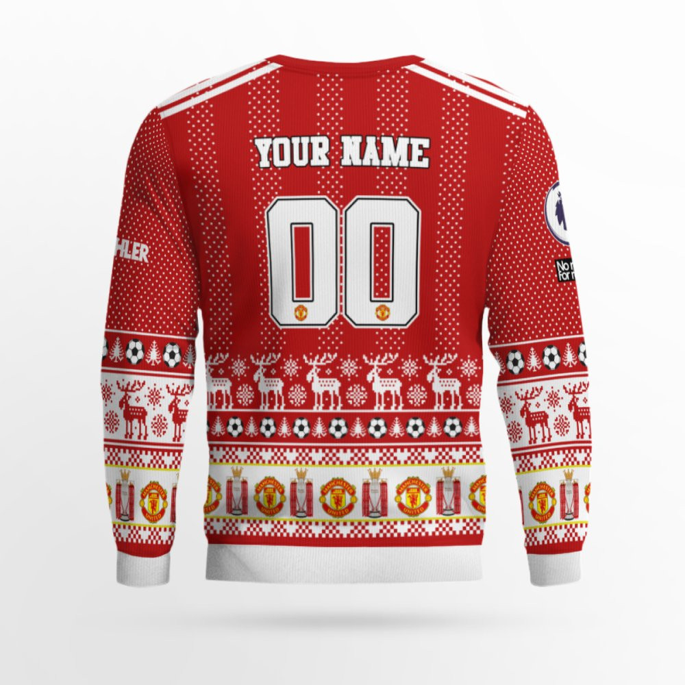 This isn’t just any Christmas sweater—this one allows you to add your custom name and number to make it uniquely yours. Featuring the legendary Manchester United colors of red, black, and gold, alongside the iconic United crest, this sweater lets you proudly display your football fandom in a fun, festive way. Whether you’re a lifelong supporter or just showing off your love for the team this holiday season, this personalized sweater is a must-have for any United fan.