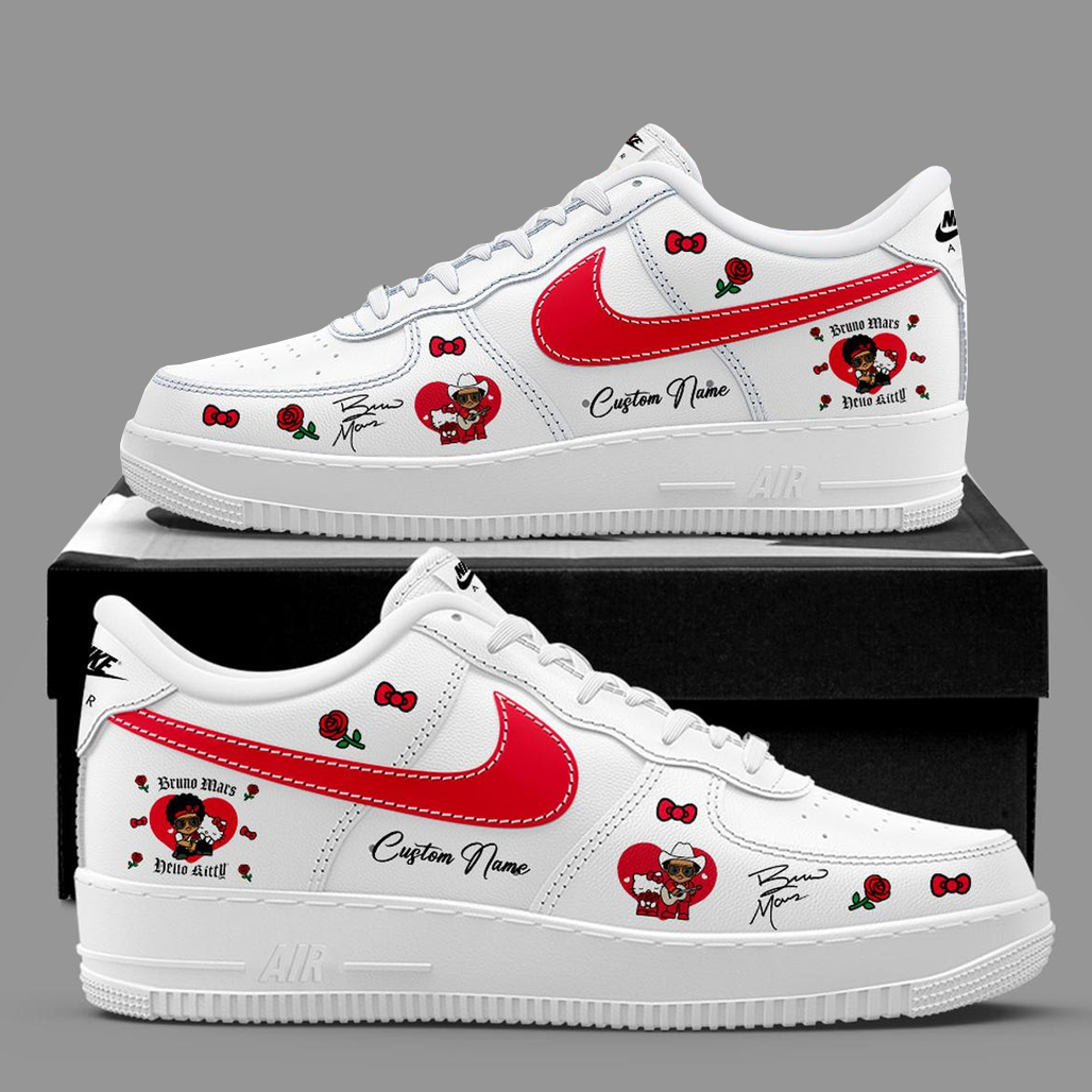 The Custom Name Bruno Mars x Hello Kitty 2026 The Romantic Tour Pop-Up Air Force 1 Shoes Sneakers are a fun and stylish choice for fans who love music, pop culture, and personalized fashion. Inspired by Bruno Mars’ romantic tour vibes and the iconic charm of Hello Kitty, these sneakers feature playful graphics paired with custom name detailing for a truly unique look.