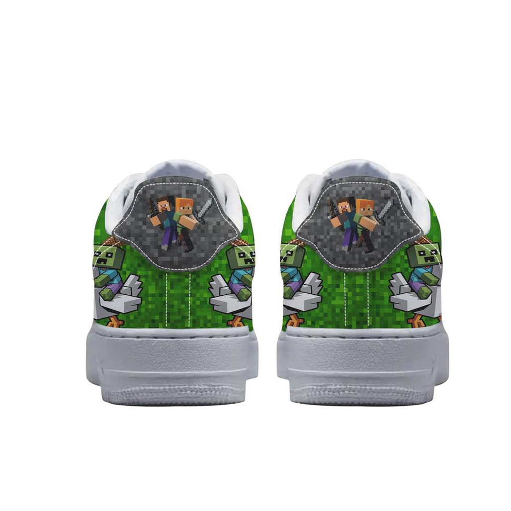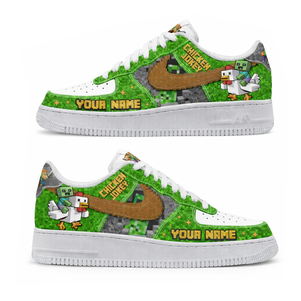 The Custom Name Chicken Jockey Minecraft Air Force 1 Shoes Sneakers are the ultimate must-have for gamers who love the rare chaos and humor of one of Minecraft’s most iconic mobs—now with a personalized twist. Inspired by the unforgettable baby zombie riding a chicken, these sneakers feature bold pixel-style graphics, vibrant block-themed detailing, and playful design elements that capture the unpredictable energy of survival mode. Built on the iconic Air Force 1 silhouette, this pair blends gaming culture with standout streetwear style in a fun and eye-catching way.