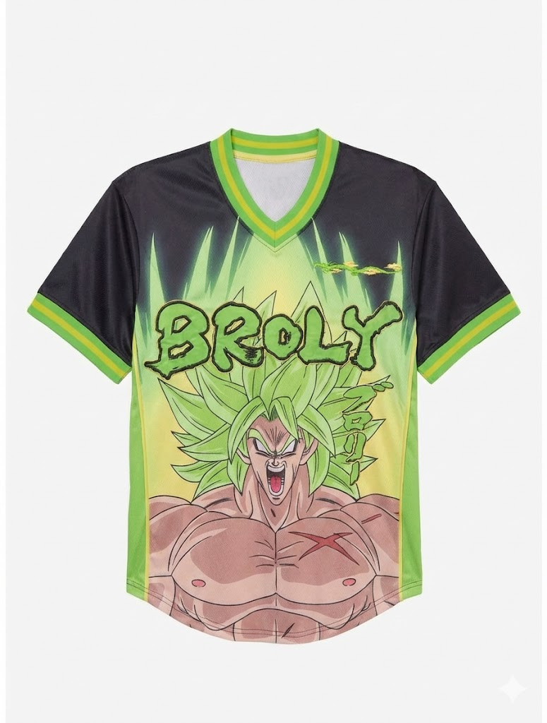 Graphic: High-impact front and back prints featuring Broly in a bold Dragon Ball Z batting-style football design