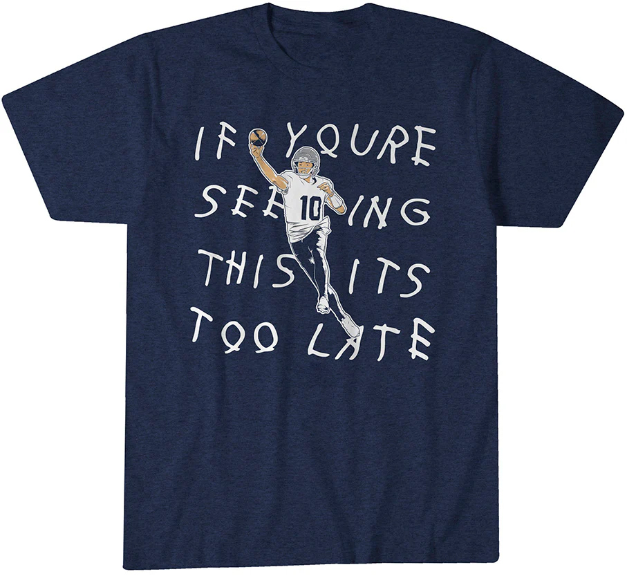 Graphic: Bold “If You’re Seeing This It’s Too Late” design with Drake Maye’s name and graphic
