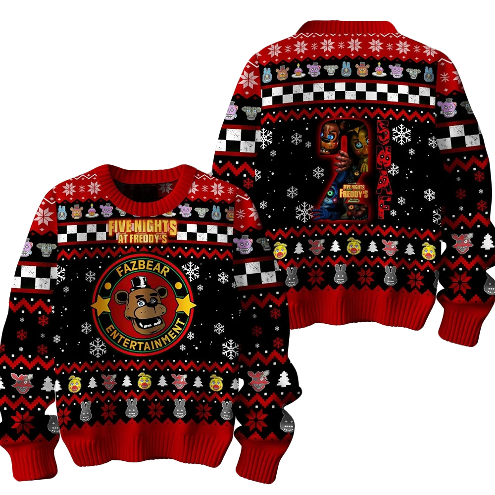 This Christmas sweater is not your typical holiday design—it’s a game-changer for fans of the Five Nights at Freddy’s series. Featuring a bold, creepy graphic of Freddy, Bonnie, and the rest of the animatronic gang, it adds a spooky twist to your festive wear. Whether you’re throwing a Five Nights at Freddy’s-themed party, enjoying a game night, or just showing off your fandom, this ugly sweater makes a spooky statement this holiday season.