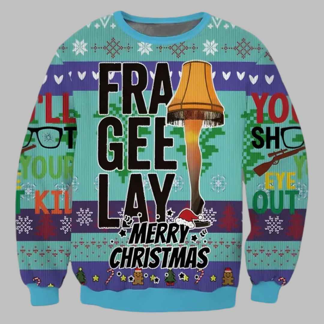 This eye-catching sweater features a vibrant design with the instantly recognizable leg lamp front and center. The words “FRA GEE LAY” are boldly displayed above the lamp, reminding everyone of the hilarious mispronunciation from the movie. The sweater also includes other fun details like Ralphie in his bunny suit, the Red Ryder BB gun, and the unforgettable phrase “You’ll shoot your eye out!”