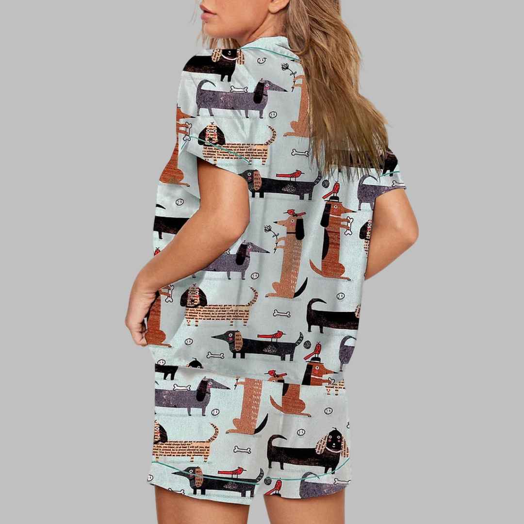 The Funny Dachshund Art Print Pajama Set features a delightful design of dachshunds in various playful poses and patterns, complete with whimsical details like bones and little birds. The artistic and humorous style of the print is perfect for anyone who adores dachshunds and loves to showcase their playful personality through fashion.
