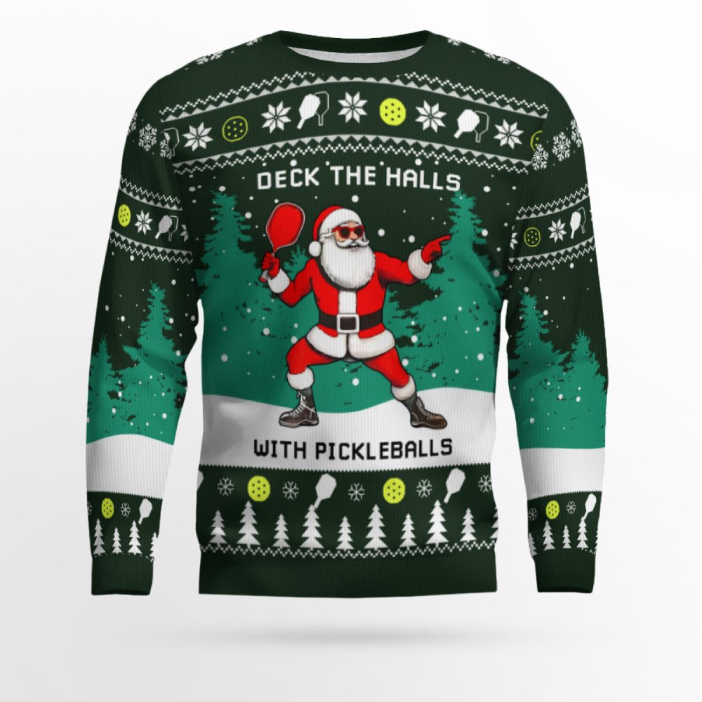 Funny Deck The Hall Pickleball Santa Ugly Christmas Sweater Funny Deck The Hall Pickleball Santa Ugly Christmas Sweater