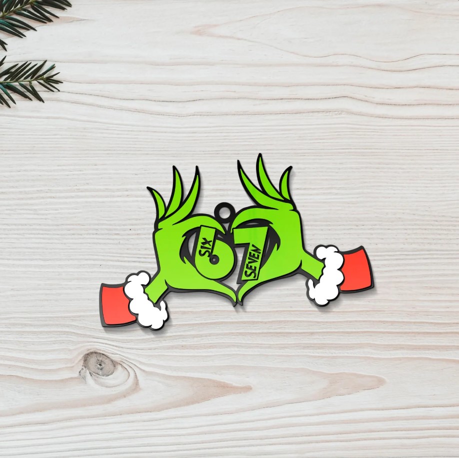 Add a quirky and expressive touch to your holiday decorations. This ornament, featuring two green hands forming a heart sign, brings fun and unconventional style, along with a special message via the prominent “Six Seven” text. It’s the ideal accessory for those who appreciate humor and modern trends.