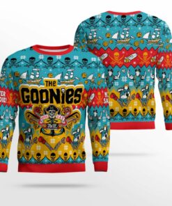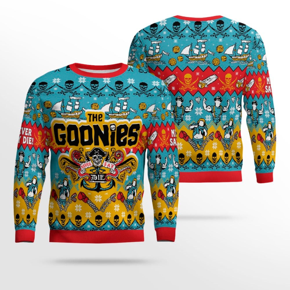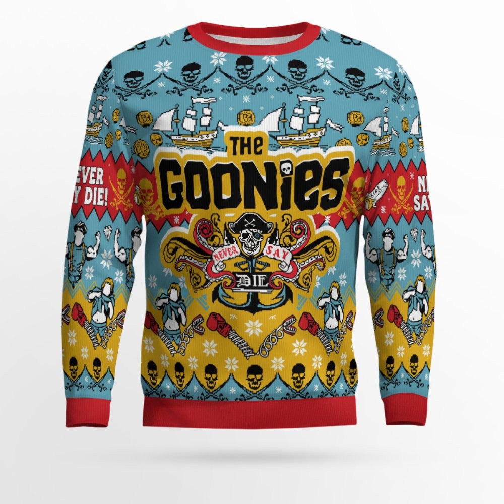 Channeling the spirit of The Goonies and the holiday season, this sweater is a perfect way to show off your love for the movie while embracing the Christmas cheer. With a playful twist on the iconic “Goonies Never Say Die” phrase, it’s ideal for those who want to celebrate the holidays in a way that’s as adventurous as a treasure hunt.