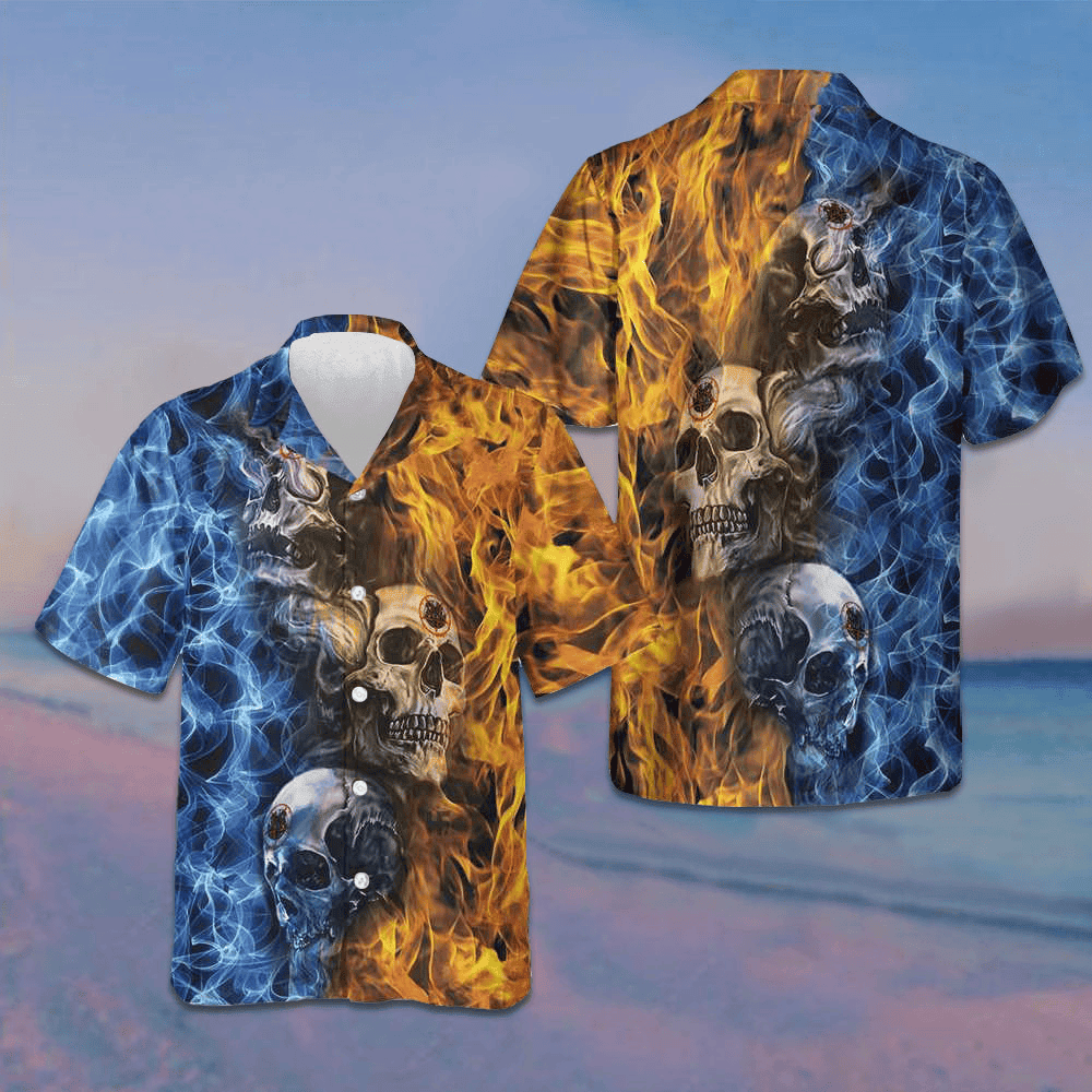 Gothic Skull Fire And Water Hawaiian Shirt Men's Button Up Gifts For Boyfriend