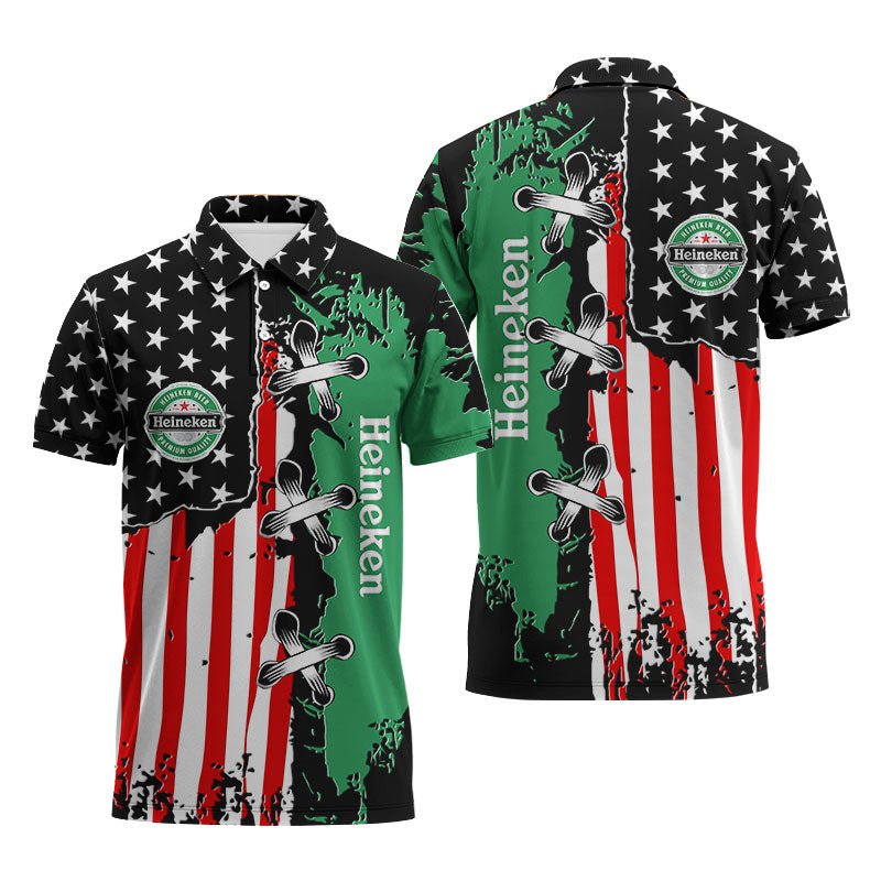 The Heineken Patriotic Grunge Flag Polo Shirt is a unique blend of style and comfort, making it an ideal choice for casual outings and gatherings. This polo shirt stands out with its distinctive design, featuring a grunge flag pattern that adds a touch of patriotism to your wardrobe.