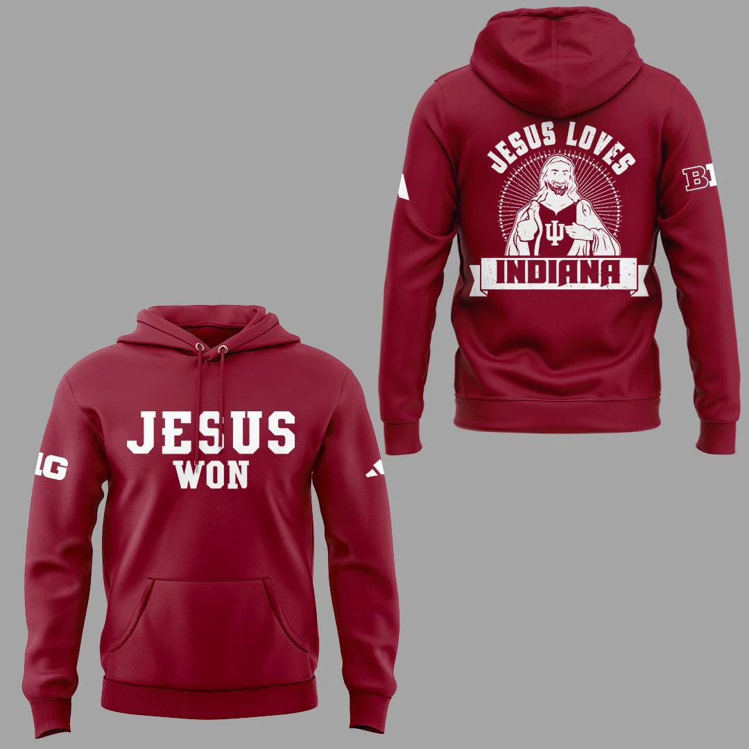 Graphic: High-impact front print combining Indiana Hoosiers National Champions elements with bold Jesus Won artwork
