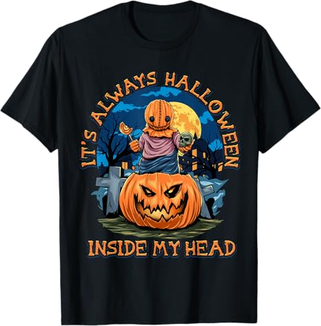 The It’s Always Halloween Inside My Head Evil Scary Pumpkin T-Shirt is the perfect way to keep the Halloween spirit alive every single day. A must-have for horror lovers who can never get enough of spooky season.