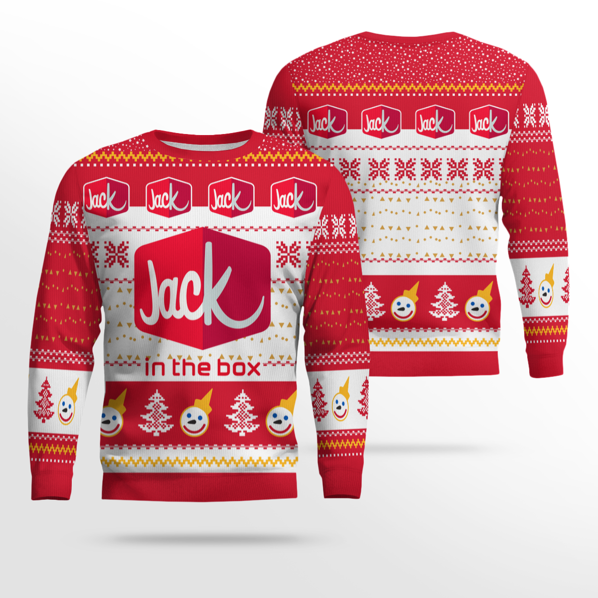 This unique Christmas sweater features a festive design inspired by Jack In The Box’s iconic branding. The sweater prominently showcases the classic Jack In The Box logo, with its signature red and yellow color scheme, and incorporates festive elements like snowflakes, Christmas trees, and of course, the smiling face of Jack himself.