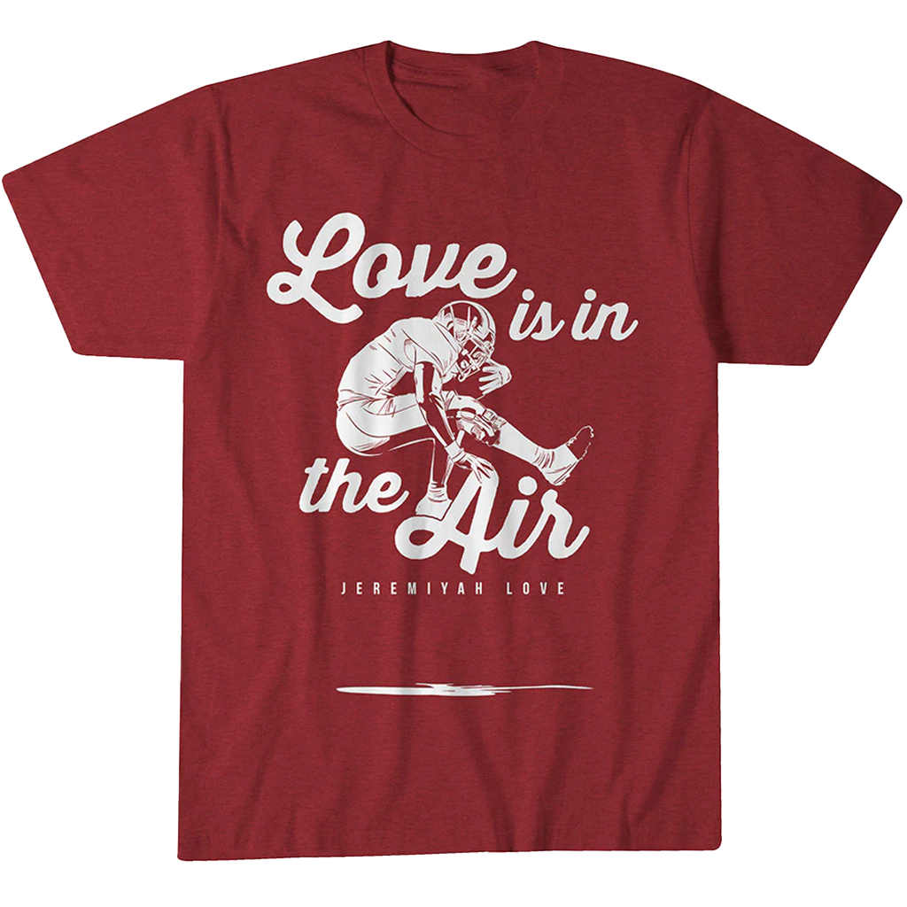 Featuring a bold “Love Is In The Air” graphic paired with Jeremiyah Love-inspired elements, the design mixes smooth style with modern sports culture. Perfect for game days, casual wear, and fans who appreciate both performance and personality, this shirt delivers comfort and standout charm.