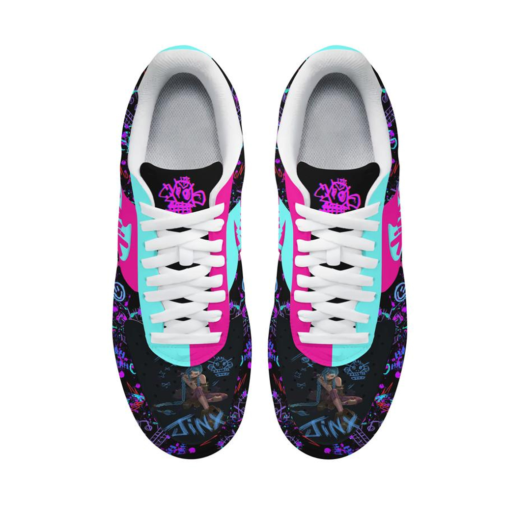 Every detail channels Jinx’s unpredictable vibe—vibrant blue panels symbolizing raw power, hot pink highlights reflecting playful destruction, and graffiti-style elements that echo her signature “was here” mark. The aesthetic feels wild, expressive, and high-voltage, blending animated intensity with modern streetwear edge.