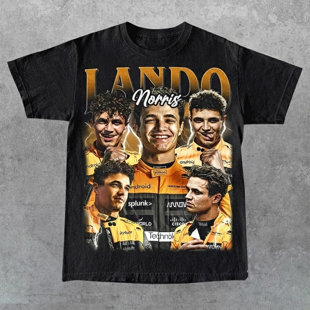 Lando Norris has become one of the most thrilling drivers to watch in Formula 1, and this vintage tee captures that excitement. The bold graphic celebrates his dynamic driving style, and the shirt brings a sense of nostalgia for fans who have followed his journey. Whether you’ve been with him since his rookie year or just discovered his talent, this tee lets you show off your love for Lando and Formula 1 in a timeless, retro fashion.