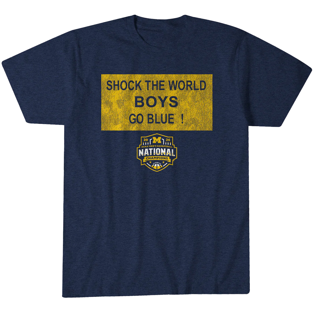 Featuring a bold “Shock the World – National Champions 2026” inspired graphic with Michigan Wolverines basketball elements, the design blends underdog mentality with clean, standout fan style. Perfect for celebrations, game days, and proud supporters, this shirt delivers comfort and unforgettable championship vibes.