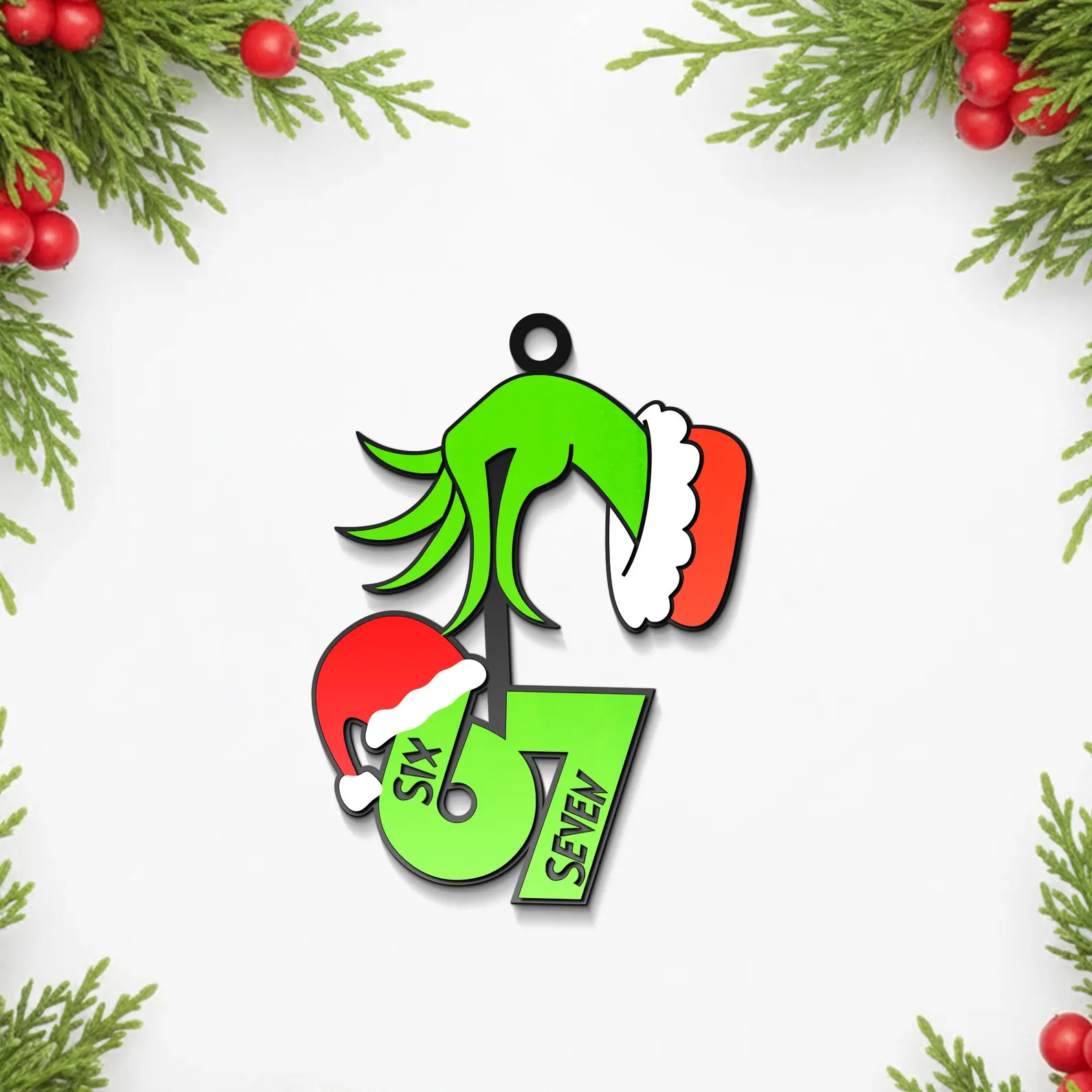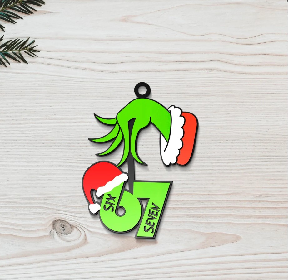 Unique Design: Features the image of the green character’s hand wearing a Santa hat, combined with the stylized numbers “67,” creating a fashionable and intriguing piece of decorative art.