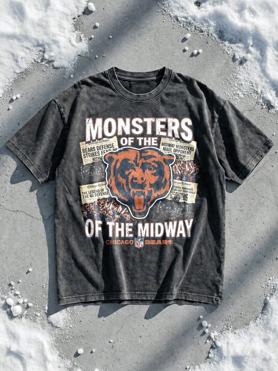 Graphic: Vintage wash “Monsters of The Midway” design inspired by Chicago Bears history and defensive dominance.