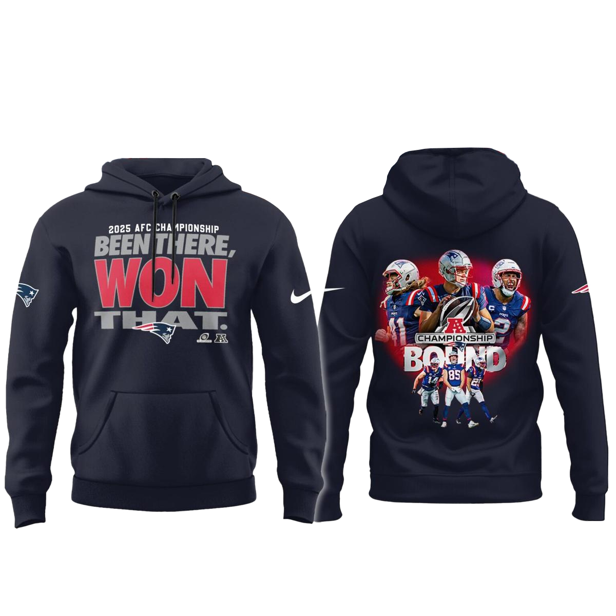 Graphic: High-impact front print celebrating the New England Patriots as 2025 AFC Bound — Go Pats!